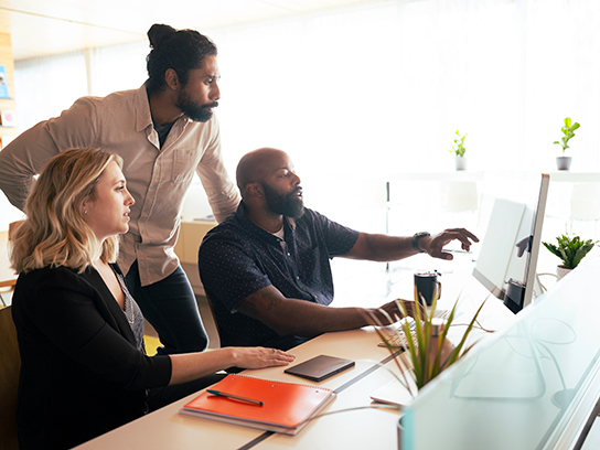 Man smiling sitting in office desk looking at laptop