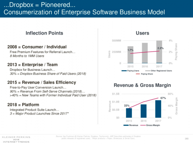 Meeker includes the great success story of Dropbox, which pioneered a consumer-grade product with enterprise appeal. Founder of the Y Combinator application Drew Houston said,